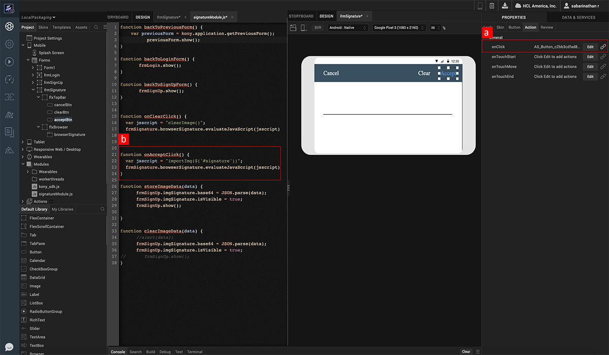 In the onClick function, construct the javascript function to be called in the hybrid context.
