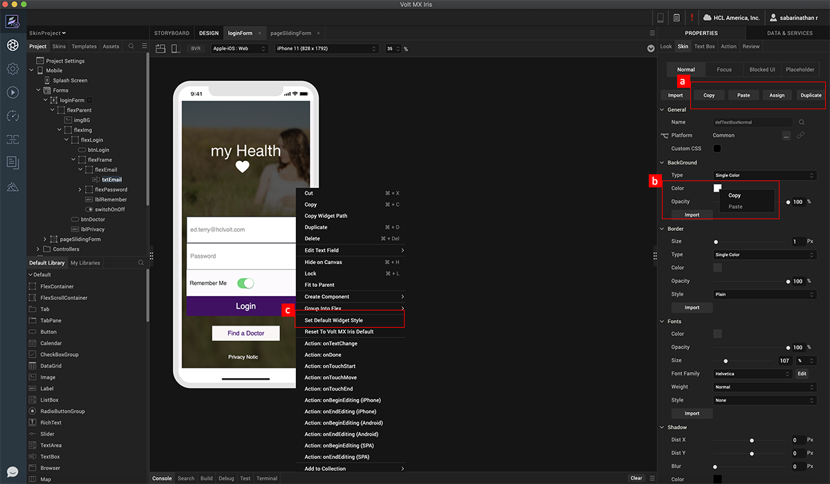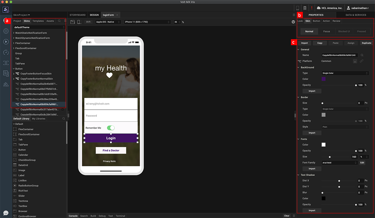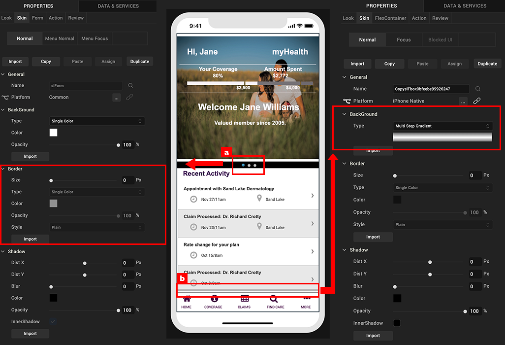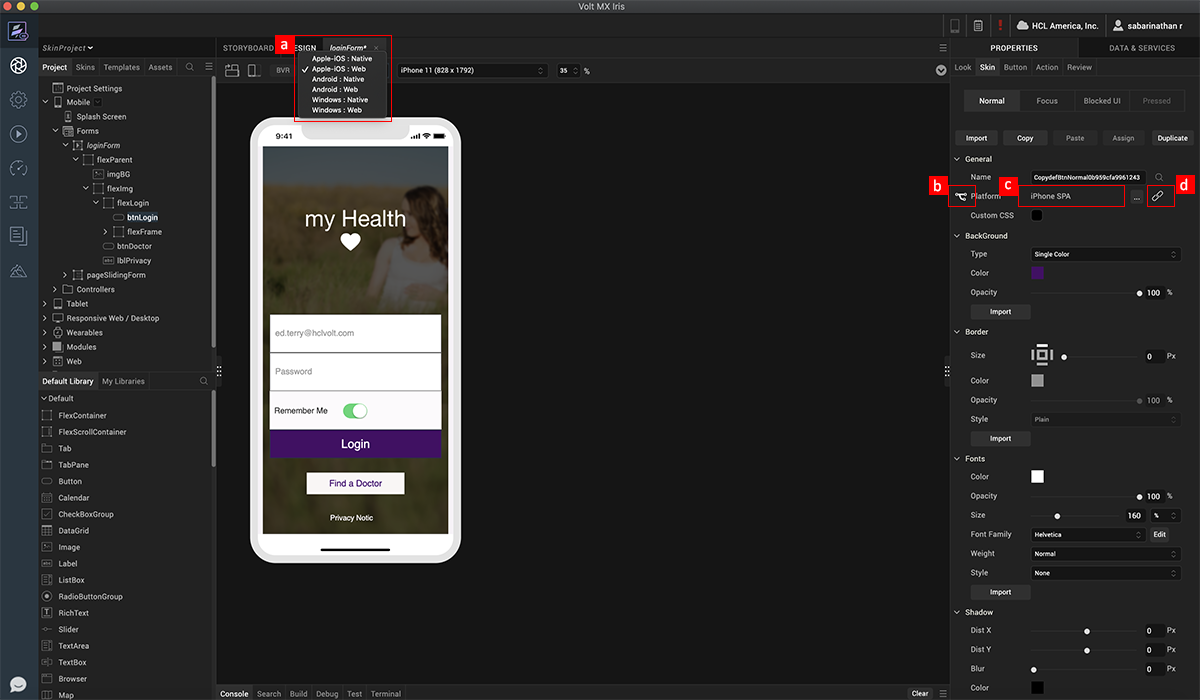 With skins, we can create native multi-channel app designs using familiar design tools and native drawing libraries. A skin is created when a widget is added to a form and modified. All the skins are organized by widgets under the skin tab.