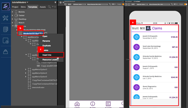 To apply a master on a tablet form, first select the tablet form and then right click on the master and select the Insert Into option.