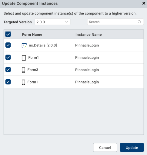 The Update Component Instance feature enables you to update the existing versions of components in a Volt MX Iris project to higher versions of the same component. You can view the higher versions that are available and choose the version you want to update to.