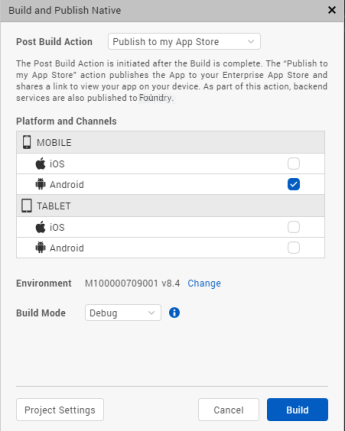 - Build and Publish Native - Builds the application for the selected native platforms and performs the selected Post Build Action. There are three types of Post Build Actions: