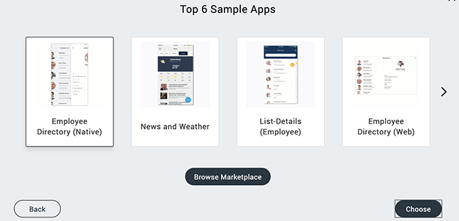 - Select one of applications and components displayed on the Sample Apps screen, and then click Choose. The selected application or component is imported to your project. Alternatively, you can click Browse HCL Forge to open the HCL Forge website. HCL Forge provides a variety of samples and components that you can add to your project.