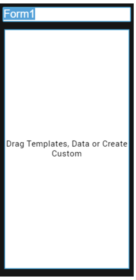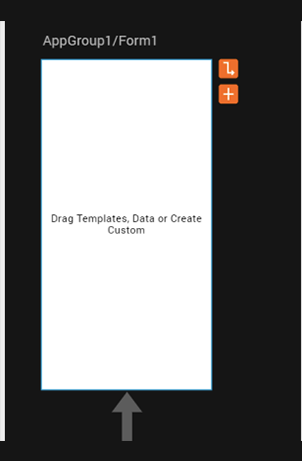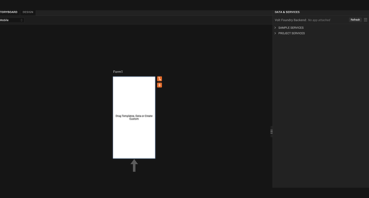 When you create a project in Volt MX Iris, the Storyboard view is displayed by default, containing one form (as shown in the image). The arrow at the bottom of the form (here, Form1) indicates that this form is the startup screen or landing page of the app.