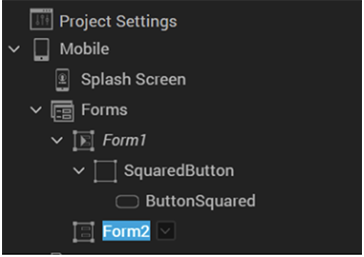 If you choose Root and then click Create Form, a new form named Form2 appears with a navigation link connecting to Form1. In the Project Explorer, Form2 is displayed under Mobile > Forms.