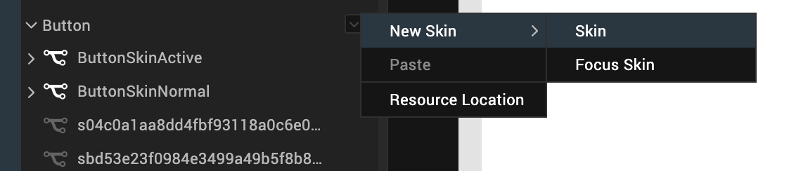 From the menu, click New Skin, and then click the type of new skin you want to create. Many widget types offer just the standard Skin, while others also offer a Focus Skin, or some variation.
