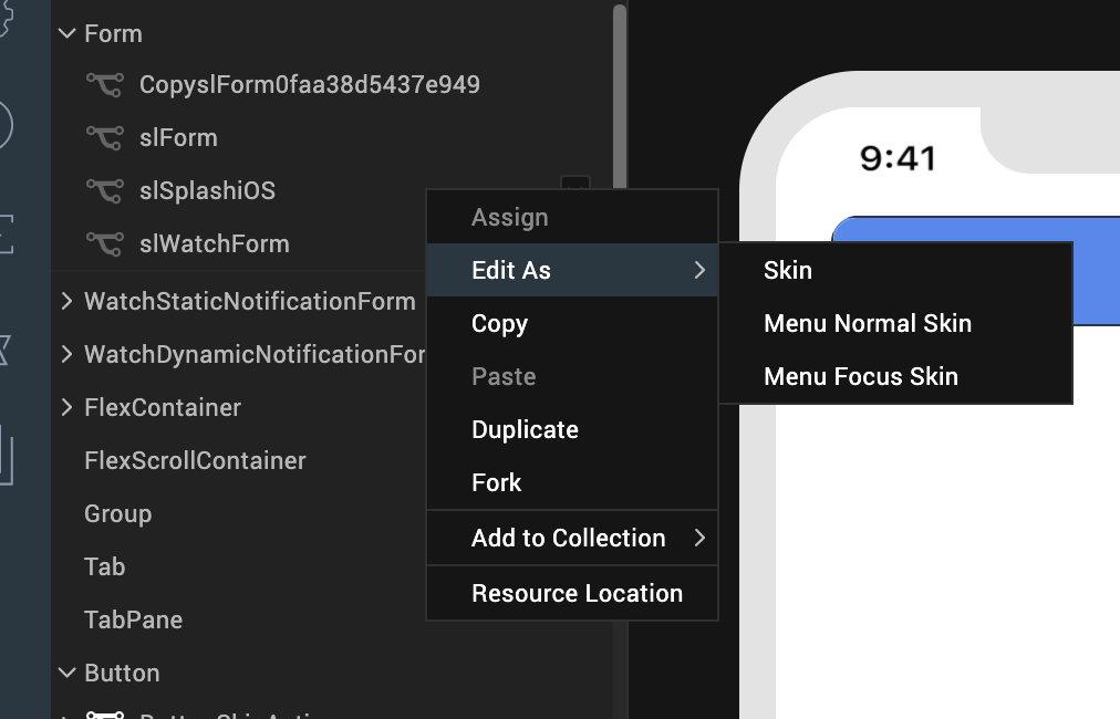 Note: You can also go to the Skins tab in Project Explorer, and right-click a skin to fork the skin.