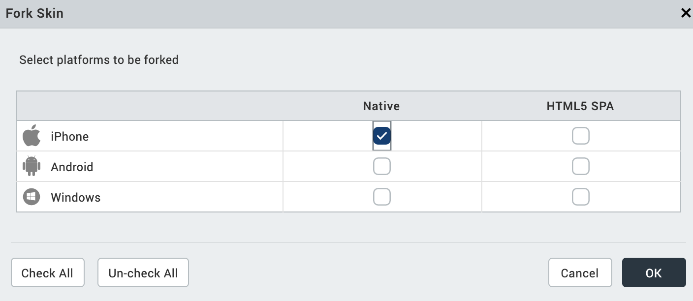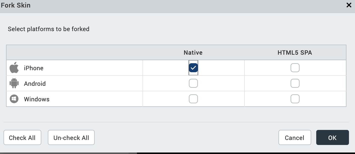 Select the platforms to fork and click OK. The skin will be forked for selected platforms.