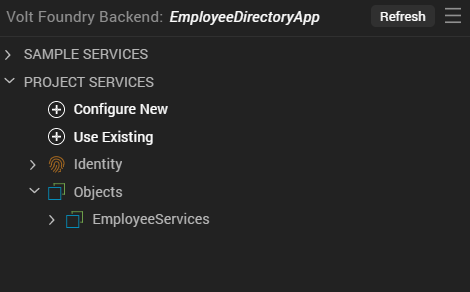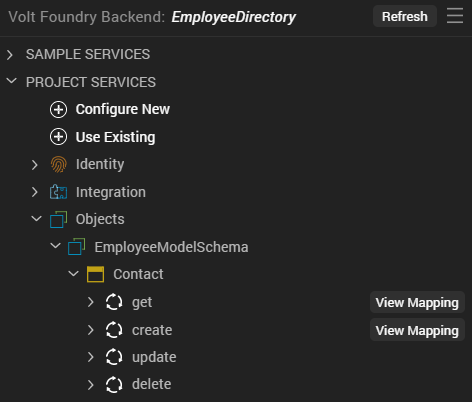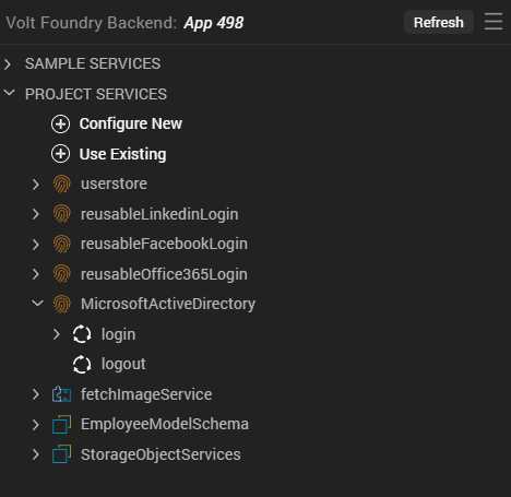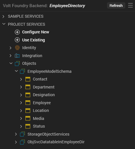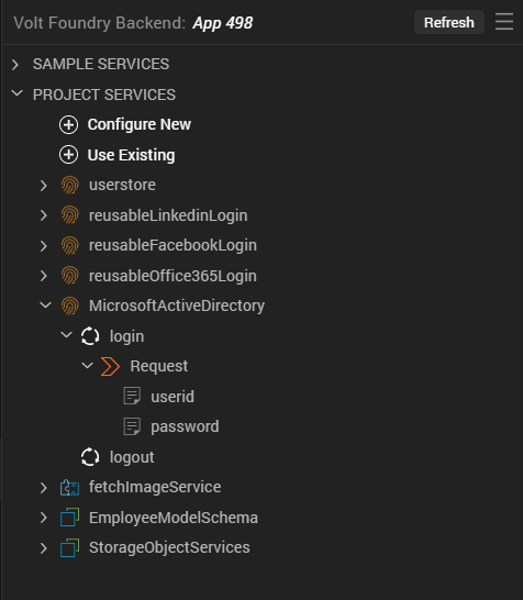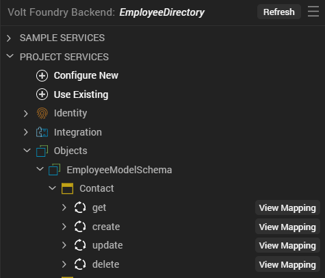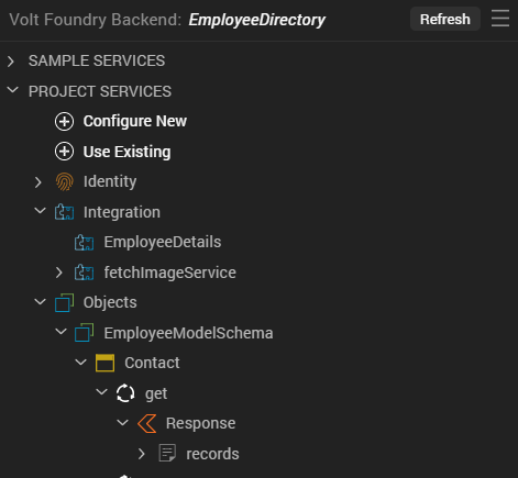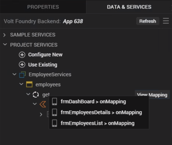 You can refresh the data in the Data & Services panel manually by using the Refresh button. When you click Refresh, the Data & Services panel fetches the latest data from your associated Volt MX Foundry application. You can use this Refresh button to update any changes you made to your Volt MX Foundry service by using the Volt MX Foundry console, from within Volt MX Iris.