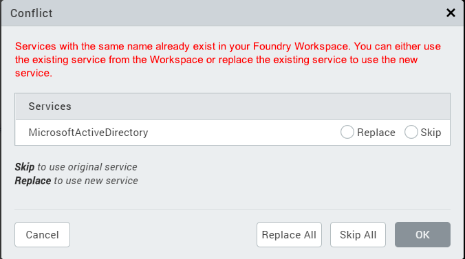 - If multiple instances of the same service exist and you want to use the original service, click Skip All.