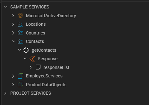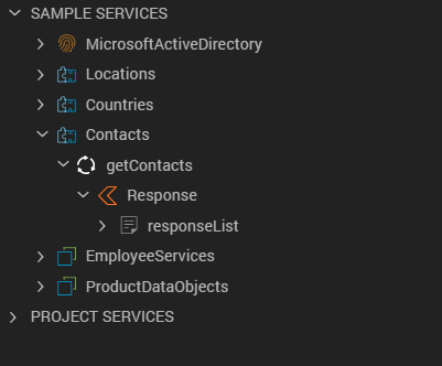 4. Expand any Integration service. Here, Locations, Countries, and Contacts are the sample Integration services. 5. Expand any service to view its available Request or Response parameter. The respective responseList or requestList is auto-displayed. Here, Contacts > getContacts > Response > responseList.