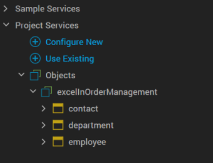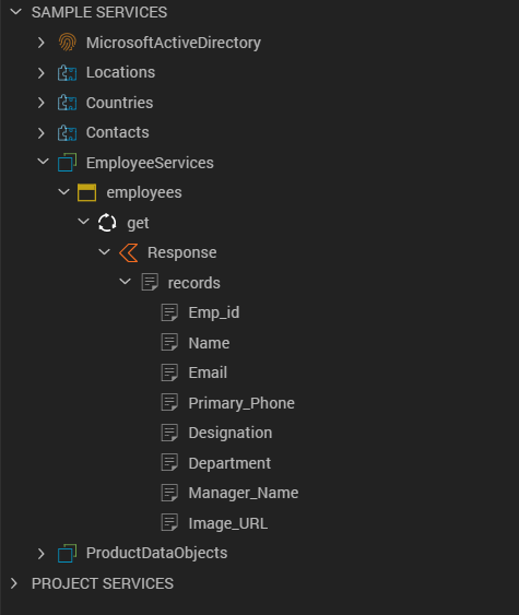 4. Expand any Object service. Here, EmployeeDataObjects and ProductDataObjects are the sample Object services. 5. Expand any Object service to view its available Request parameter. The respective responseList or requestList is auto-displayed. Here, Employee Services > employees > get > Response > records.