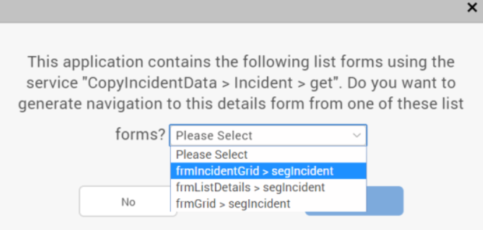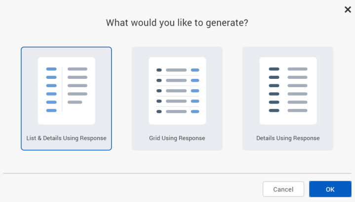 A dialog box appears asking you to generate either a List, or a Details, or an Entry form. You can select any of the three options as follows:* List Using Response: If the response contains a collection, a Segment is added to the parent form. This Segment is mapped to the Response parameter of the service. * Entry form for Request: A FlexScrollContainer containing TextBoxes and Labels is added. The TextBoxes are mapped to the Request parameters of the service. > **_Note:_** For the GET method in Object Services, the Entry form for Request option is disabled. * Details Using Response: A FlexContainer containing Labels is added. These Labels are mapped to the Response parameters of the service.-
