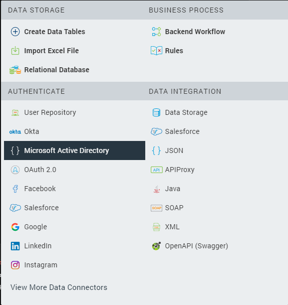 Note: The Data & Services panel supports all types of Identity providers such as Volt MX user Store, Google, Salesforce, and Facebook.