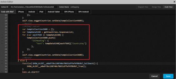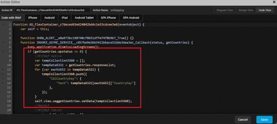 9. Click Code View to see the code details of the data mappings. For Mobile
