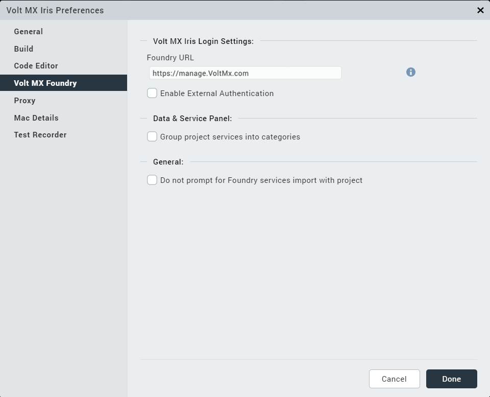 In Volt MX Iris V9 SP 2, the VoltMX Foundry node and associated actions have been shifted from the Project Explorer to the Data & Services panel. This feature has been introduced to enable a unified and enhanced user experience of using Volt MX Foundry data and services from within Volt MX Iris.
