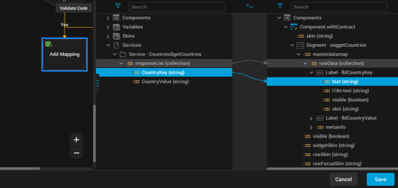 Select the List Using Response option. A Segment (for example, seggetCountries) is added to the component, a list form is generated on the Project Canvas, and the mappings between various elements are auto-generated in Mapping Editor.