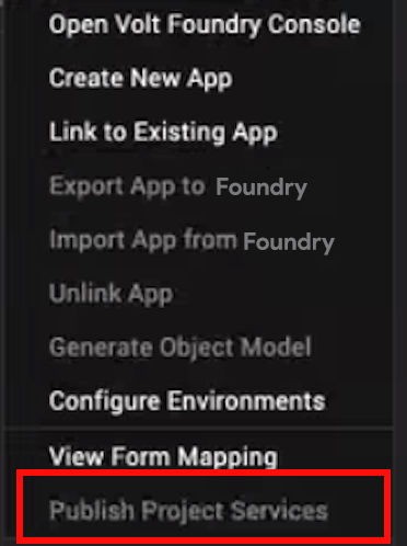 at the upper-right corner of the Data & Services panel. From the list of options that appears, you can perform the following Volt MX Foundry-related actions: