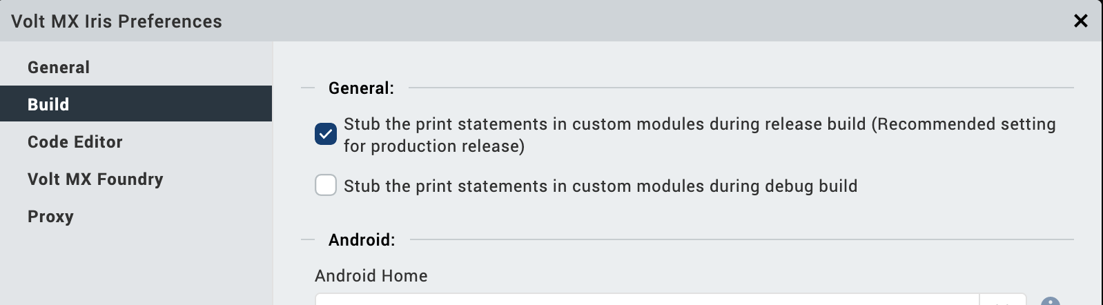 - Debug Mode builds. To disable the generation of print statements during Debug Mode builds, select the check box of the option titled Stub the print statements in custom modules during debug build.