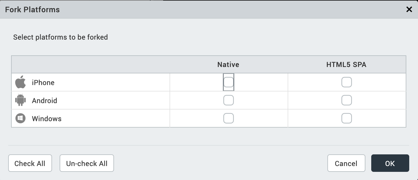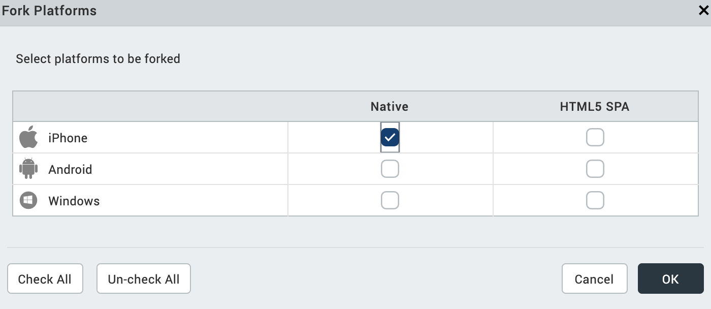 Expand Forms, click the context menu arrow of the form you want to fork, and then click Fork.The Fork Platforms dialog box displays.