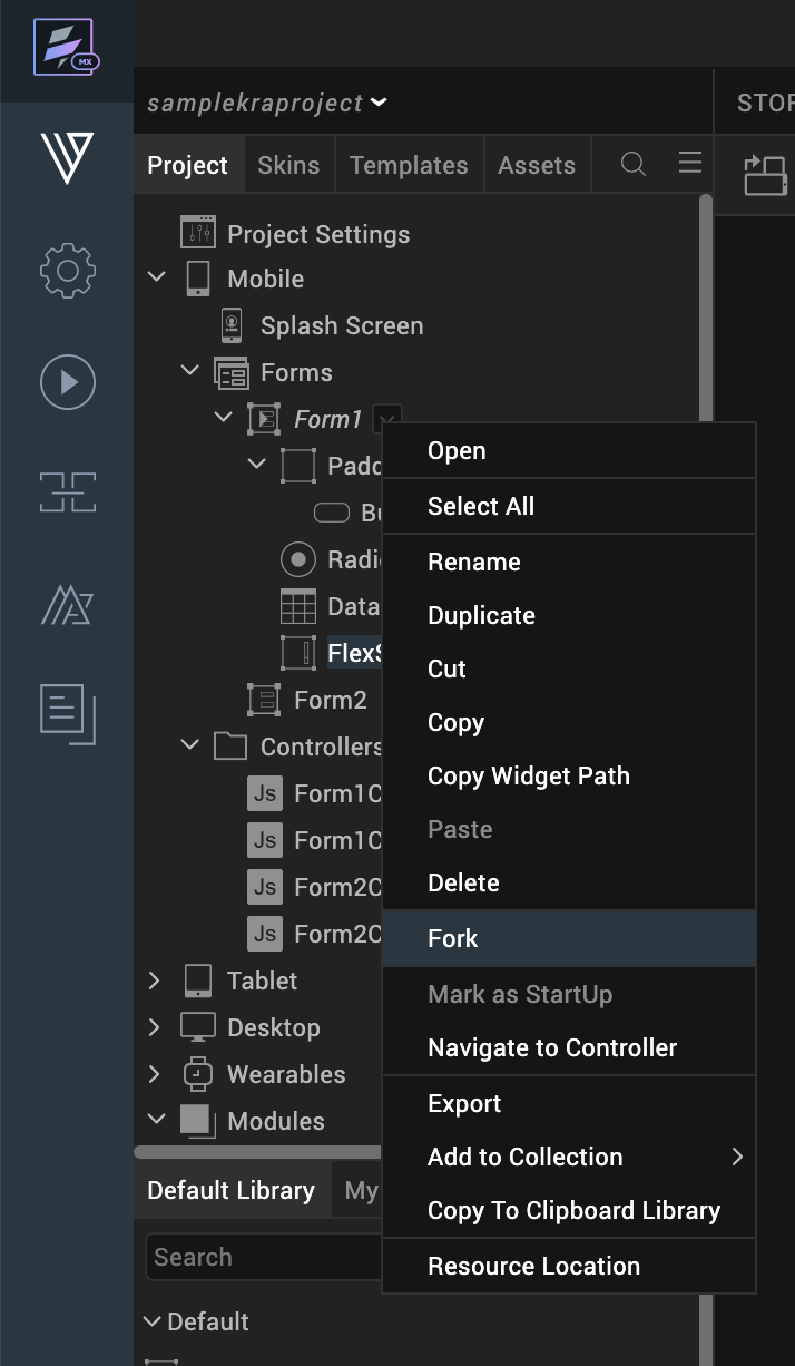 - In the Project Explorer, on the Project tab, expand the channel with the form you want to fork, either Mobile, Tablet, or Desktop.
