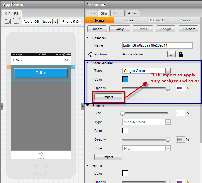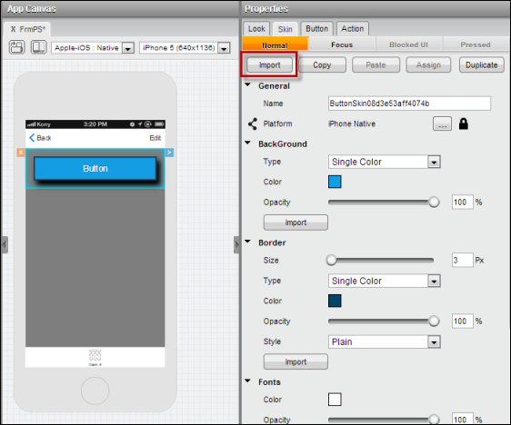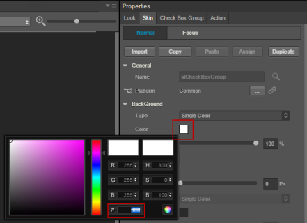 Volt MX Iris gives you the ability to copy a color from Photoshop and assign this color to any of the widget’s skin properties such as the Background, Border, Font, Shadow, and Font Shadow.