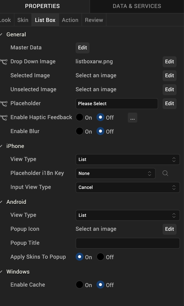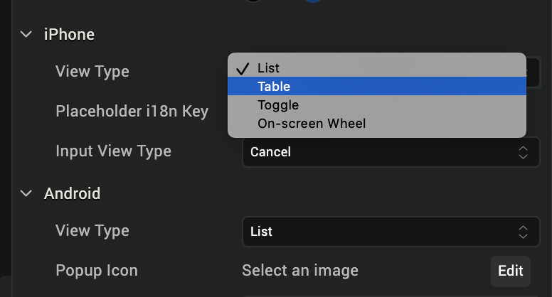 Specifies the list box view mode. Select a view type from the View Type drop-down list under either the iPhone or Android properties. The options available for iOS and Android vary.