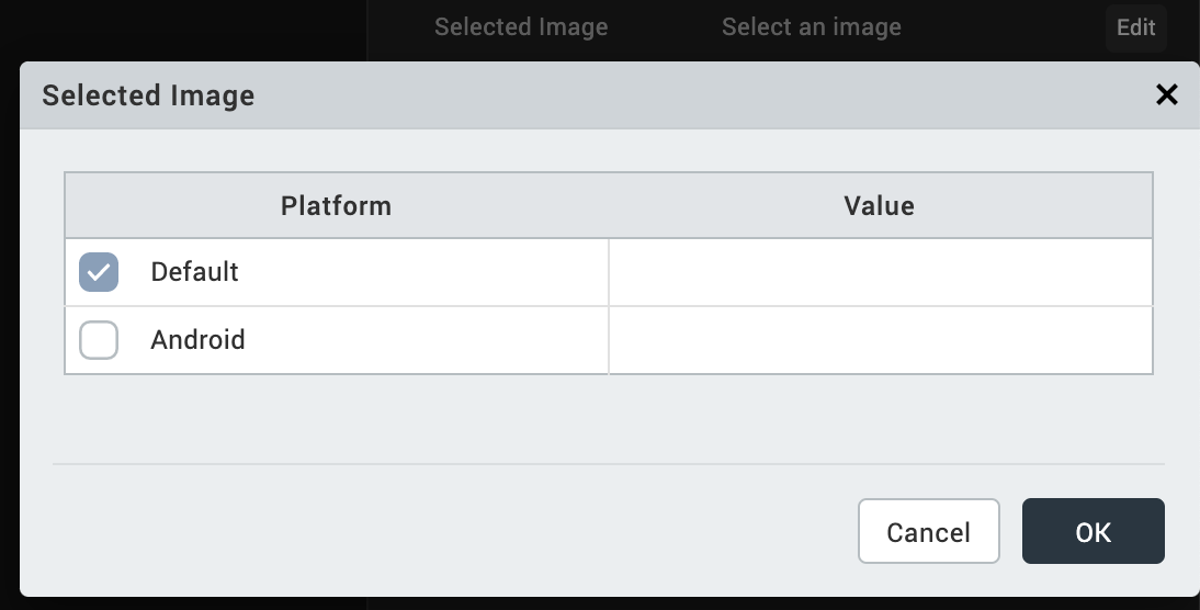 To specify a default image or a platform-specific image, click the Edit button to open Selected Image dialog box.