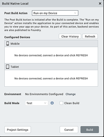 - Generate Native App – This action generates the binaries and build logs for your Native application and saves it on your file system