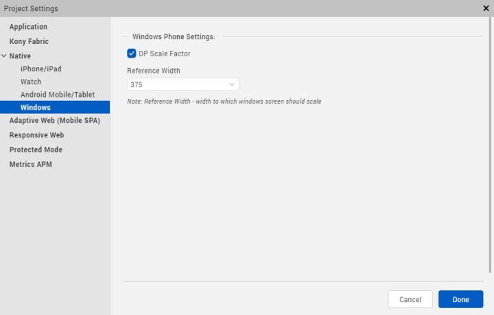 | Windows | DP Scale Factor | The factor by which you should multiply the dp units to get the actual pixel count for the current windows screen. Enable DP Scale factor to modify Reference width. |