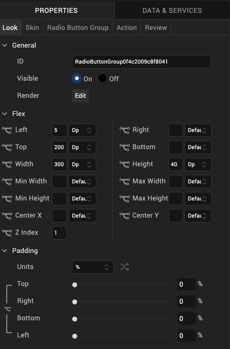 RadioButtonGroup properties specify properties that are available on any platform supported by Volt MX Iris, and assign platform-specific properties.