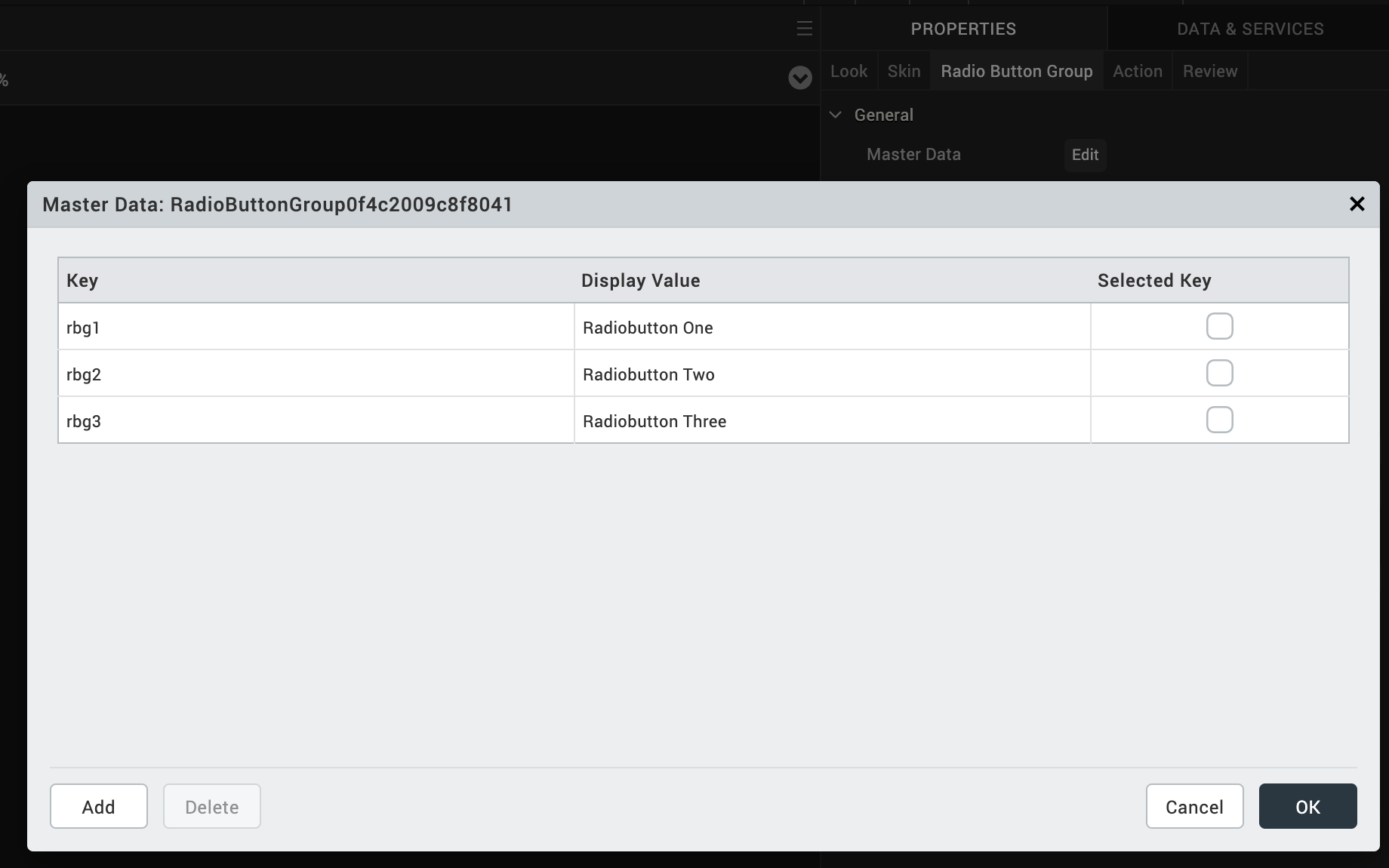 To add more radio buttons to the widget, click Add. To delete a radio button, click inside a cell, and then click Delete.