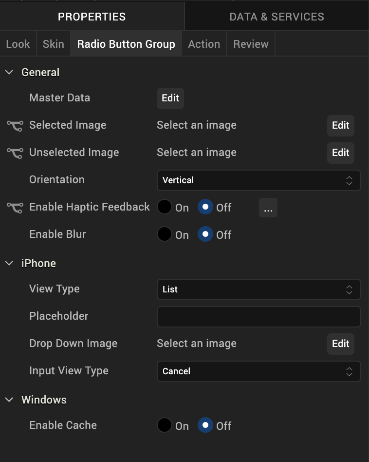 For the iOS platform, specifies the view type of the RadioButtonGroup , either List, Table, Toggle, or On-screen Wheel.