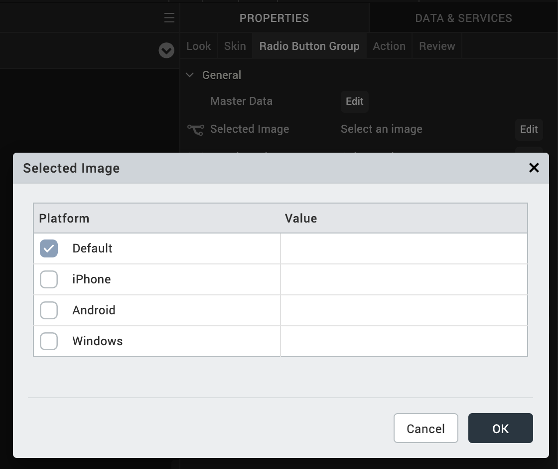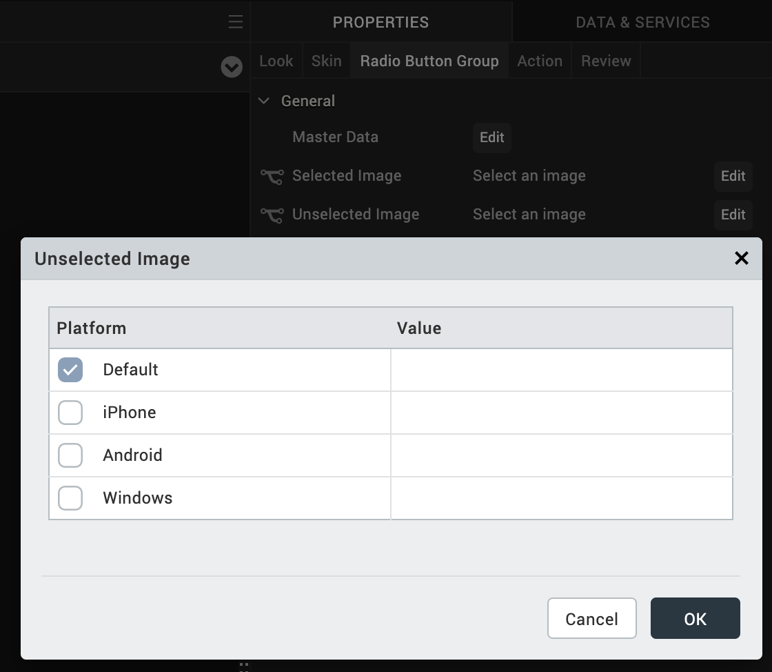 To provide a default or platform-specific image, click the Edit button to open the Unselected Image dialog box.