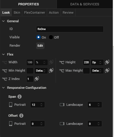 Span and Offset properties override the positional and width properties of direct child widget. Therefore, in addition to the Span and Offset properties, you can only configure the following Flex properties for the child FlexContainer widget of the Responsive Container: