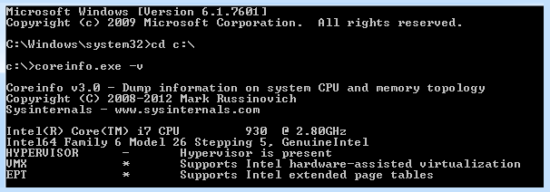 For example, for an Intel CPU, if the processor supports SLAT, an asterisk (*) displays in the EPT row, indicating support for extended page tables, as seen here.