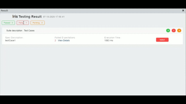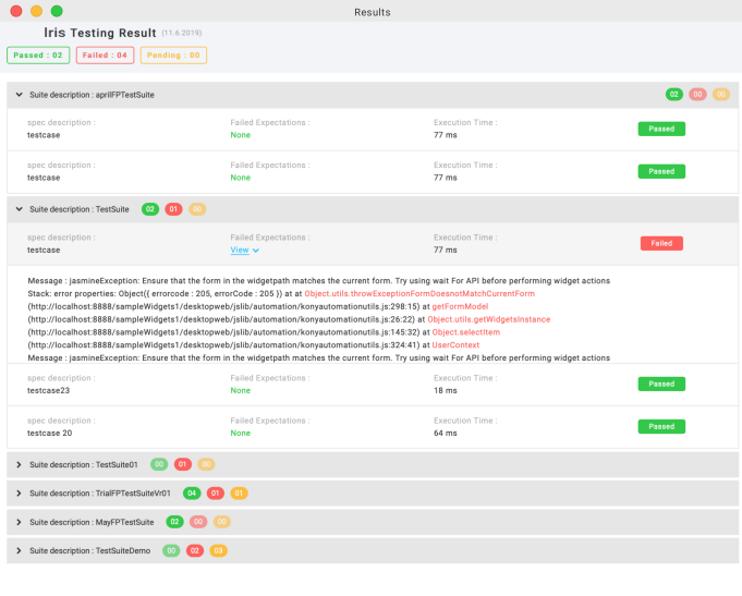 The number of passed test cases, failed test cases, and pending test cases are displayed across each test suite. Furthermore, you can expand the test result of each test suite to view more information such as: * Spec description: Displays the name of the test case. * Failed exceptions: Displays the location of errors in the test case along with the file location.