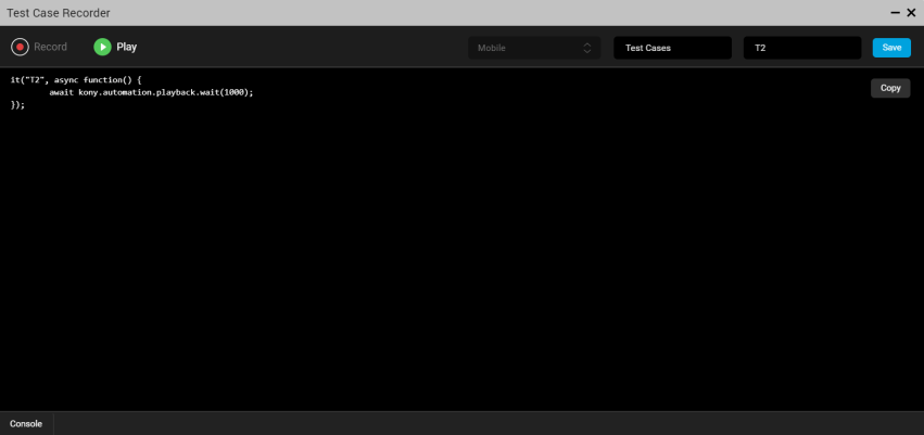 To play the recorded script, re-launch the app and click Play. The recorded script plays in the Iris Preview window. You can view the result of the test case in the Console tab.