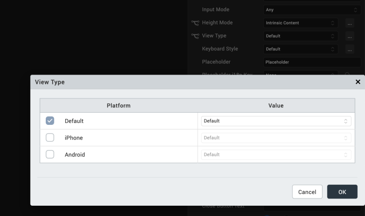 The selected view type becomes the default for all the platforms. To provide a platform-specific value or a different default value, click the Ellipsis button (...) to open the View Type dialog box, and then select a value.