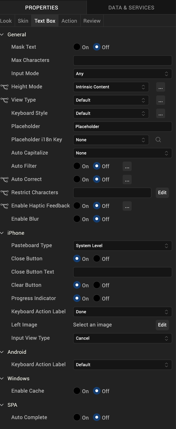 TextBox properties specify properties that are available on any platform supported by Volt MX Iris, and assign platform-specific properties.