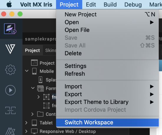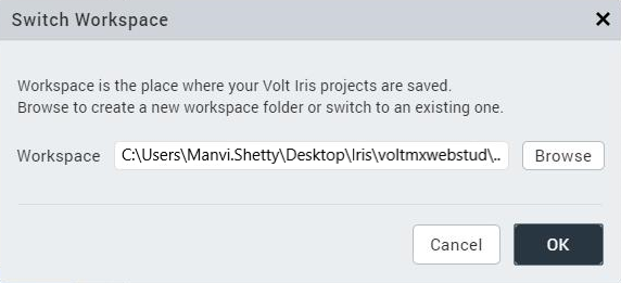 You can switch your workspace either during the VoltMX Iris startup process or from within Volt MX Iris. This feature helps you to switch the workspace when the default workspace has an issue or is not valid. Furthermore, you can switch the workspace if you want to access projects that are located in another workspace.