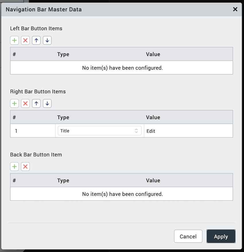 | Master Data | Collection of bar button items that can be set to the properties (Left Bar Button Items, Right Bar Button Items, and Back Bar Button Item). |
