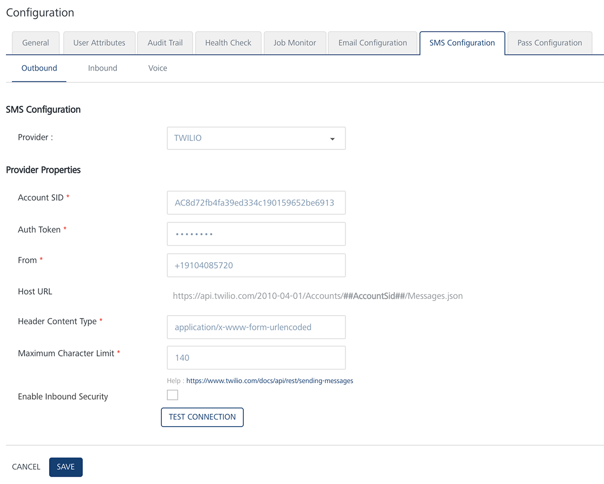 Outbound: In the SMS Configuration section, select the provider from the drop-down list to setup the account. The following example displays the Twilio as the selected SMS service provider.