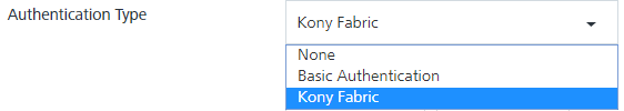 Authentication Type: The Authentication Type drop-down list has three options as None, VoltMX Foundry, and Basic Authentication. In the example, Basic Authentication is selected.