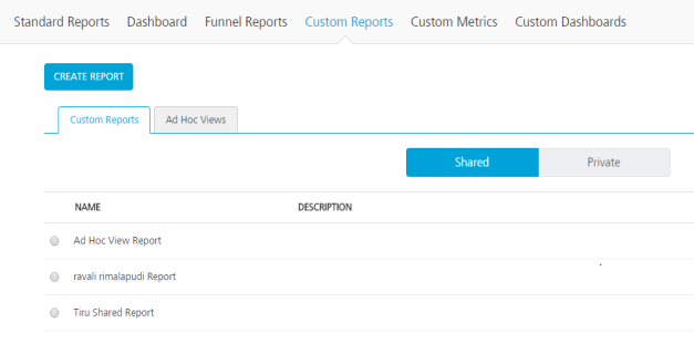 After you have saved your custom reports, you can run them from the Custom Reports screen. Ensure that you have saved the report in Shared or Private folder. You can run custom reports from the Custom Reports screen. For this, you need to have created and saved the Report and Ad Hoc view.