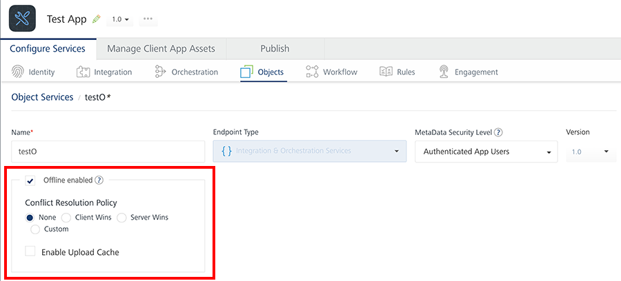 You can enable conflict resolution policy in Foundry Console under the Objects Service section. The Conflict Resolution Policy check box is displayed only when you select the Offline enabled check box. The default value is None.