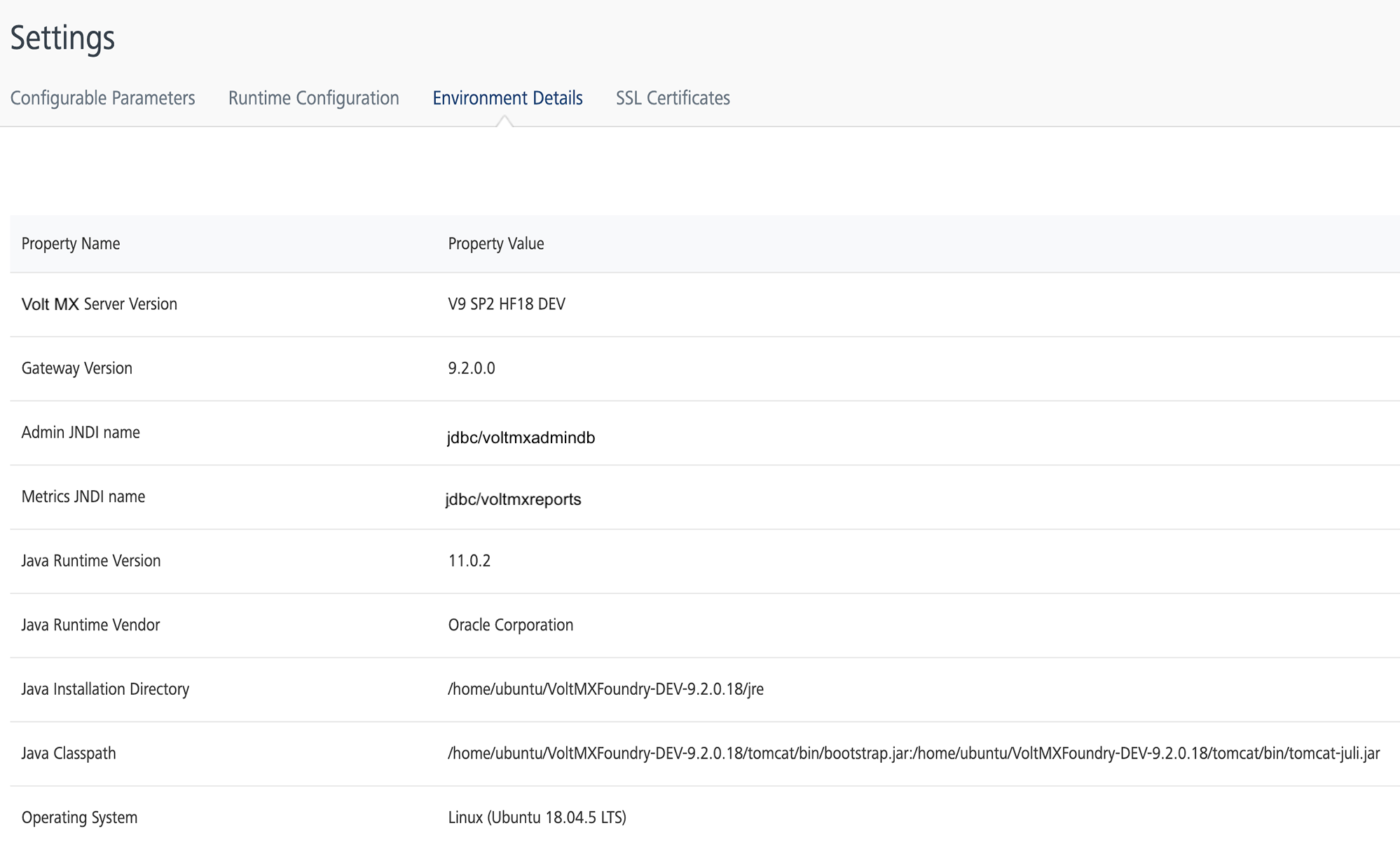 The environment details page displays the environments details of the Volt MX server. This page displays a table with two columns the Property Name and Property Value.