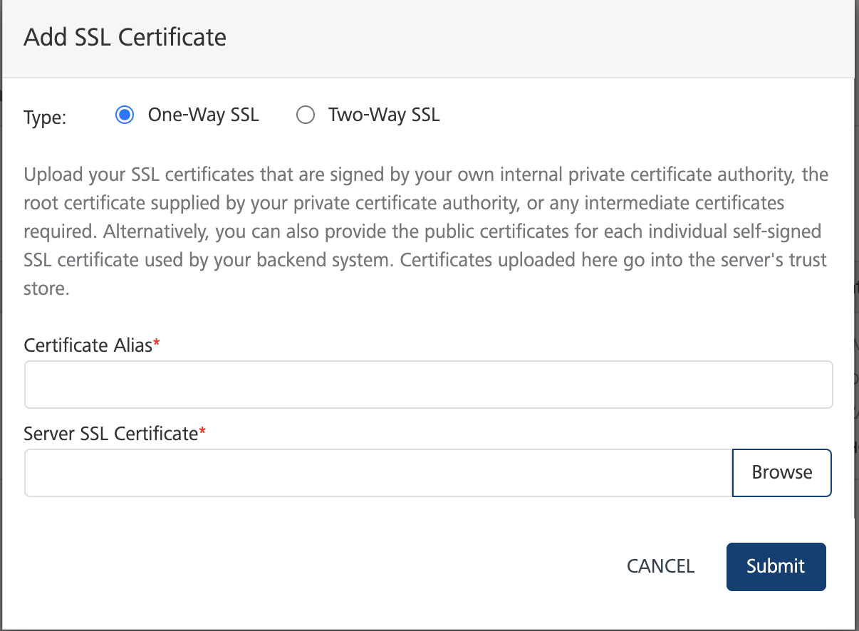 You can upload One-way SSL certificates the root certificate signed by your own internal private certificate authority or any intermediate certificates. Enter the required details in the fields provided to upload a one-way SSL certificate:
