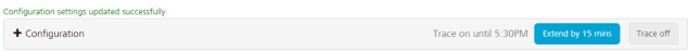 Once the trace log is enabled, a message Trace on until $time is displayed with Extend by 15 minutes and Trace off buttons.