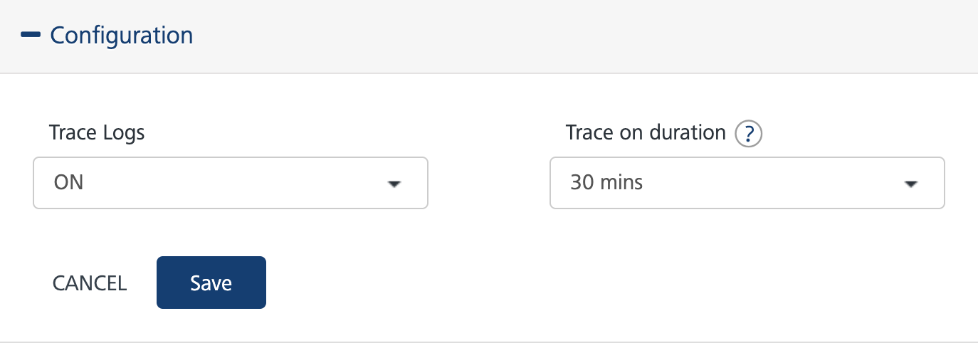 Log configuration can be set from the Trace Logs drop-down list. Trace logs can be enabled or disabled by selecting ON or OFF from the drop-down list.