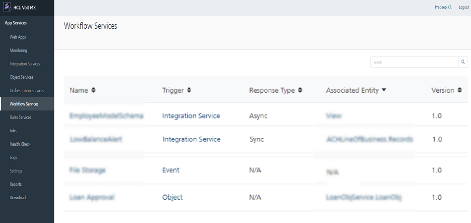 It lists all the Workflow Services that were published to the current environment from Volt MX Foundry Console. You can view all the instances of the Workflow that were triggered from here and the run-time status of each triggered instance from here. To know more about Workflow service, refer Workflow Service.